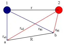 , donde e es la carga elemental y r12 es el valor esperado de la distancia entre los electrones. A veces se la llama integral de canje porque también puede expresarse como una integral a todo el espacio de tipo: