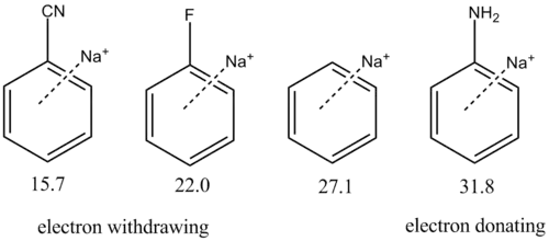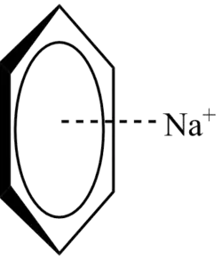 A partir de simples consideraciones electrostáticas, (ley de Coulomb), los cationes pequeños y con mayor carga positiva conducen a atracciones electrostáticas más fuertes. La siguiente tabla muestra una serie de cambios en la energía libre de Gibbs para la interacción del benceno con algunos metales alcalinos en la fase gaseosa.[2] La influencia del radio iónico, , es evidente.