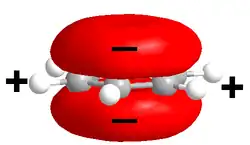El benceno, sistema π modelo, no tiene un momento dipolar permanente, pues las contribuciones de los enlaces carbono-hidrógeno débilmente polares se cancelan debido a la simetría molecular. Sin embargo, el sistema π rico en electrones sobre y debajo del anillo de benceno implica una carga negativa parcial. Como contrabalance, hay carga positiva asociada en el plano donde yacen todos los átomos de hidrógeno, con lo que resulta un cuadrupolo eléctrico (un par de dipolos, que no se cancelan entre sí). El sistema π cargado negativamente puede interactuar favorablemente con los iones cargados positivamente.