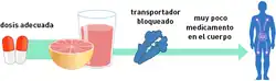 - La inhibición mediada por el jugo de pomelo de las proteínas transportadoras de membrana desde el intestino a la sangre, o la inhibición de las enzimas que activan un profármaco a un metabolito activo, conduce a dosis insuficientes del fármaco en el cuerpo, lo que resulta en la pérdida del efecto terapéutico.[28]