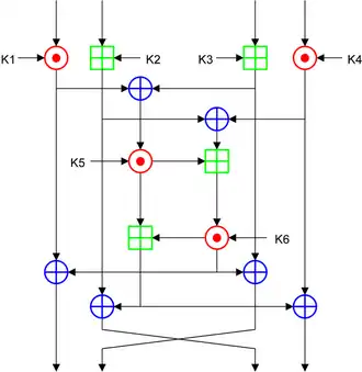 - Multiplicación módulo 216+1, donde la palabra nula (0x0000) se interpreta como 216 (indicada con un círculo punteado rojo⊙)