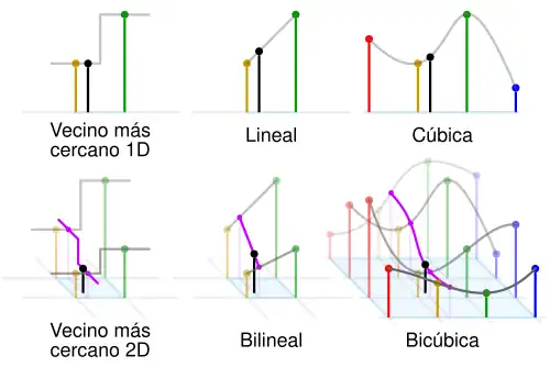 Comparación de la interpolación bicúbica con algunas interpolaciones unidimensionales y bidimensionales. Los colores Negro y Rojo/Amarillo/Verde/Azul corresponden al punto interpolado y a las muestras vecinas, respectivamente. Sus alturas sobre la referencia horizontal corresponden a sus valores