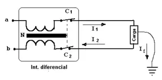 La diferencia entre las dos corrientes de los hilos del suministro es la que produce un campo magnético resultante, que no es nulo y que por tanto producirá una atracción sobre el núcleo N, desplazándolo de su posición de equilibrio, provocando la apertura de los contactos C1 y C2 e interrumpiendo el paso de corriente hacia la carga, en tanto no se rearme manual o automáticamente el dispositivo.