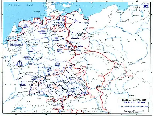 La invasión comenzó cuando los Aliados cruzaron el río Rin. Luego se extendieron y se movieron a través del oeste de Alemania. Los alemanes se rindieron el 8 de mayo de 1945. Esto se conoce como la "Campaña de Europa central" en las historias militares de Estados Unidos.