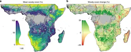 En el África subsahariana, la cobertura vegetal leñosa ha aumentado un 8 % durante las últimas tres décadas, principalmente debido a la invasión de plantas leñosas. En total, 750 millones de hectáreas de biomas no forestales experimentaron aumentos netos significativos en la cobertura de plantas leñosas, lo que supone más del triple de la superficie que experimentó pérdidas netas de vegetación leñosa.[33] En alrededor de 249 millones de hectáreas de pastizales africanos, se descubrió que el cambio climático a largo plazo era el factor clave del cambio en la vegetación.[34] En toda África, el 29 % de todos los árboles se encuentran fuera de los bosques clasificados. En algunos países, como Namibia y Botsuana, este porcentaje supera el 80 % y probablemente esté relacionado con la invasión de plantas leñosas.[35]En el sur de África, la invasión de especies leñosas se ha identificado como el principal factor del reverdecimiento, es decir, del aumento de la cobertura vegetal detectado mediante teledetección.[23][36]La tendencia futura del cambio de biomas debido a la invasión de especies leñosas en África es muy incierta.[37]