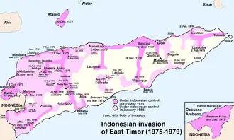 La invasión indonesia de Timor Oriental comenzó el 7 de diciembre de 1975 cuando el ejército de Indonesia invadió Timor Oriental con el pretexto de la lucha contra el colonialismo. Se derrocó al breve gobierno del Fretilin y se desató una violenta ocupación que duró hasta 2002 que costó la vida de 60 a 100 mil locales.[3]