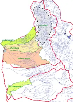 En la imagen de la derecha se ven los sectores hidrogeológicos de aprovechamiento común en la Región de Arica y Parinacota según una shapefile publicada en la mapoteca de la Dirección General de Aguas del Ministerio de Obras Públicas de Chile para el año 2022. En rojo las cuencas hidrográficas o ítems del inventario de cuencas de Chile. El SHAC "Lluta Alto" no aparece en la shapefile y fue agregado por Wikipedia.