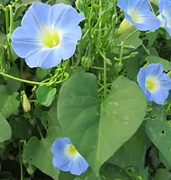 Planta herbácea, trepadora, voluble, anual; tallo ramificado, sin pelos; hojas ovadas a anchamente ovada, de (3)4 a 8 cm de largo por 2.5 a 5.5(8) cm de ancho, ápice acuminado, 2 inflorescencias con muchas flores; sépalos de 5 a 8 mm de largo, margen blanco-escarioso, glabros; corola con forma de embudo (infundibuliforme) a subcampanulada, de 2.5 a 3.5 cm de largo, azul celeste o a veces algo violácea, tubo blanquecino a verdoso-amarillento en el exterior, amarillento en la garganta; el fruto es una cápsula ovoideo-cónica; con 4 semillas de forma elipsoides u obovadotriangulares, de 4 a 6 mm de largo, con pequeñas escamitas.[1]