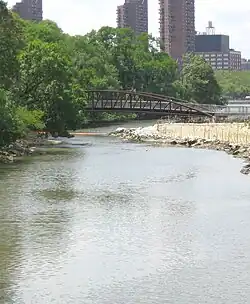 En 1937, Robert Moses desarrolló planes para construir un puente peatonal que cruzara el río Harlem desde East Harlem, un puente que proporcionaría a los residentes de Manhattan un fácil acceso al nuevo parque de Wards Island. Sin embargo, la construcción real de este puente de Wards Island , también conocido como 103rd Street Footbridge, no comenzó hasta 1949.[43][44] Diseñado también por Othmar Ammann y construido por el Cuerpo de Ingenieros del Ejército de los Estados Unidos,[45] la pasarela fue originalmente conocida como el puente peatonal del río Harlem.[46] Este puente se abrió a los peatones el 18 de mayo de 1951 y se completó a un costo de 2.1 millones de dólares.[47] Da acceso al Parque de la Isla Wards desde el East Harlem, que tiene pocos espacios verdes públicos.