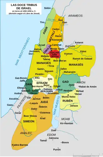 Estas tribus hebreas, que tenían el mismo origen que los amorreos y hablaban un dialecto de la misma lengua semítica que ya se hablaba en Canaán, cruzaron el río Jordán alrededor del año 1240 a. C. y conquistaron Jericó, desde donde se extendieron por las regiones montañosas de la zona, adoptando el alfabeto semítico y muchos otros aspectos de la cultura cananea. Según la tradición, a finales del siglo XI a. C. Saúl estableció el primero de una serie de reinos israelitas en Canaán, los cuales la gobernarían intermitentemente durante los siguientes mil años.[52] Hacia el año 1000 a. C. se establecieron dos reinos, Israel y Judá, que llegaron a formar una monarquía unida en oposición militar a los filisteos y otros pueblos limítrofes. Según la historia tradicional basada en las Escrituras, este reino unificado fue gobernado por los reyes Saúl, David y Salomón antes de su separación definitiva (en el año 924 a. C.); la estela de Tel Dan es aceptada generalmente como la más antigua (y única hasta la fecha) evidencia arqueológica de la existencia de la dinastía de David.