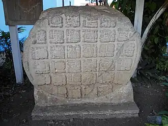 ![]() Escultura del dios remero jaguar en la Estela 2 de Ixlú, actualmente en el parque central de Flores | ||