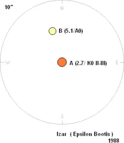Izar (ε Boo / ε Bootis / 36 Bootis) es la segunda estrella más brillante de la constelación de Bootes, con magnitud aparente +2,35. Es una estrella binaria cuyas dos componentes están separadas 3 segundos de arco y está considerada una de las estrellas dobles más bellas del cielo.