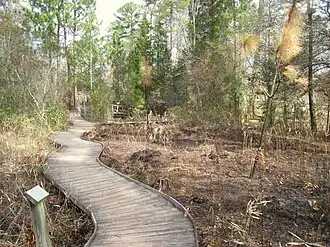 Pasarela de madera a través del Coastal Plain and Sandhills Habitat Gardens. | ||