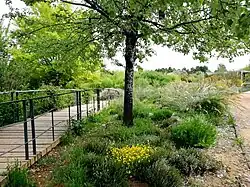 Zona destinada a la exhibición de estas plantas originarias de zonas cálidas y/o secas, mediante la selección de especies resistentes al frío. Sobre un lecho de grava de diferentes colores, según el grupo botánico, se muestra una colección de cactus (Echinopsis oxygona, Cleistocactus strausii, Opuntia macrocentra…), otra de ágaves (Agave parryi, Agave nigra, A. victoriae-reginae…) y yucas (Yucca carnerosana, Y. thompsoniana, Y. torreyi…). En las proximidades de este parterre, también se puede contemplar una pequeña colección de palmeras resistentes a los rigores del invierno mediterráneo continental (Sabal minor, Brahea armata, Butia capitata…).