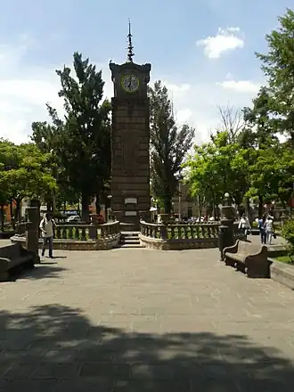 Es distintivo su reloj de cantera, donado por la colonia española para conmemorar el Centenario de la Independencia de México.[5] De 1926 a 1927 se construyó la balaustrada que la rodea. El jardín ha tenido la misma apariencia desde una remodelación de 1953.[6]
