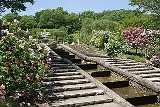 ![]() Escalinata con cascada en la rosaleda del jardín botánico Kitayama. | ||