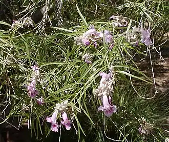 - Arbustos, como el "Desert Willow" (Chilopsis linearis) arbusto o árbol que es nativo de los desiertos de California a Texas y norte de México, donde crece en bordes de cauces y lechos de torrentes.