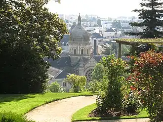 Se ubica en la parte alta de la ciudad, por encima del río Mayenne.