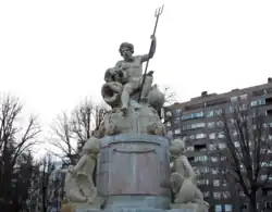El dios Neptuno aparece como la gran figura del conjunto escultórico, bajo él un delfín. En la parte inferior aparecen tres tritones ofreciendo gansos a Neptuno. La obra es obra de Mariano Salvatierra (Neptuno) y Felix Cusac (tritones) . La fontanería es obra de Isidro Cruela como la mayoría de las fuentes de este periodo. La fuente fue restaurada en el 2019.
