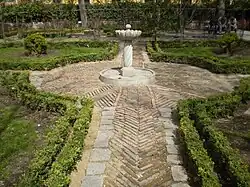 Consta de tres áreas bien diferenciadas. El cuerpo central, el más importante, está dividido en cuatro cuadrantes, entre los cuales se abren varios caminos, realizados con ladrillos aparejados a sardinel. En la intersección de los mismos, aparece situada una fuente de reducidas dimensiones, labrada en granito. Está formada por una columna y una taza, que presentan relieves en espiral, a modo de columna salomónica.