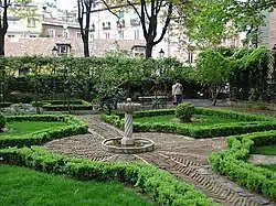 El jardín combina árboles de grandes dimensiones con pequeños parterres, delimitados por setos de boj y con plantaciones de pradera.