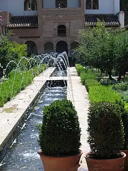 Las norias, de tracción animal o humana, traen el agua a los estanques (aljibes).[12] En la Alhambra, un acueducto de 10 kilómetros trae el agua a las cisternas superiores desde un represa en la cercana Sierra Nevada. Las acequias que atraviesan el pavimento unen los estanques en un complejo flujo por gravedad. Al igual que en los oasis, las acequias riegan las plantas de una manera totalmente controlada. Los parterres están divididos por muros de contención, atravesados por pequeños tubos de barro cocido. Bloqueados sucesivamente por una simple piedra, permiten el riego a cada nivel del jardín. Este papel funcional se combina con los valores simbólicos y religiosos: el Corán, en efecto, impone ciertas abluciones antes de la oración. La limpieza del cuerpo se expresa por la abundancia y la sofisticación de los baños y sus anexos.
