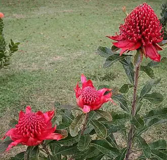 Inflorescencias de Telopea speciosissima en los jardines Palheiro de Madeira. | ||