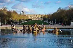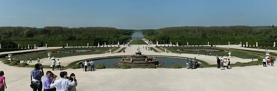 En 1661, después de la caída en desgracia del ministro de finanzas Nicolas Fouquet, que malversó fondos de la corona para edificar su Palacio de Vaux-le-Vicomte, Luis XIV centró su atención en Versalles. Con la ayuda del arquitecto de Fouquet, Louis Le Vau, el pintor Charles Le Brun y el arquitecto paisajista André Le Nôtre, el rey inició el embellecimiento y ampliación del parque, en un proyecto que le ocupó hasta el fin de su reinado.[5]