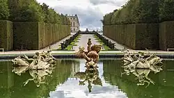- Parterre de Agua: situado sobre el estanque de Latona, sobre el eje norte-sur, forma la terraza del palacio y es el elemento de transición entre éste y los jardines. En 1664 Luis XIV encargó una serie de esculturas con el fin de decorar los juegos de agua del Parterre de Agua. Cada estanque cuenta con cuatro estatuas recostadas que simbolizan los ríos de Francia (el río Loiret, el Loira, el Ródano, el Saona, el Garona, el Dordoña, el Sena y el Marne), acompañados por ninfas y niños. El parterre constituye un lugar de reunión en el que se usa el imaginario y simbolismo decorativo de los Grandes aposentos del palacio, pero con la iconografía del jardín.[9]
