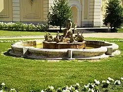 En la fachada principal existen unos parterres que antiguamente estaban cubiertos de flores, ahora se pueden ver gravas de colores adornando el entorno de dos pequeñas fuentes.