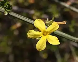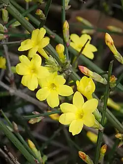 Jasminum nudiflorum es una especie de arbusto de la familia de las oleáceas. Es originaria del sudeste de Tíbet al centro de China.