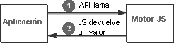 Aquí se puede apreciar el "recorrido" de una instrucción mandada desde la aplicación. El primer paso lo inicia la aplicación que manda una instrucción , que luego, el motor de Javascript la interpreta y hace las manipulaciones pertinentes y después devuelve el valor.