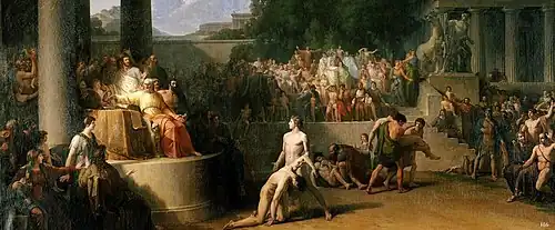 En el primer Salón de París bajo la Revolución, en 1791, expuso tres versiones pequeñas de lo que parece que pretendía ser un grupo de cuatro grandes cuadros que mostraban las costumbres de diferentes pueblos antiguos, y también las cuatro Edades del Hombre. En París se expusieron La selección de los niños en Esparta, Las bodas germánicas (estas dos pequeñas versiones se encuentran actualmente en Múnich) y Los Juegos Olímpicos. [5] Todas ellas fueron producidas a su considerable tamaño natural. Los Juegos (hacia 1791, 209,5 × 386 cm) y la Selección (hacia 1786, 138 centímetros × 260 cm) se encuentran actualmente en Ginebra, y la Boda (hacia 1788, 136,5 × 259 cm) en la Fundación Oskar Reinhart, Winterthur. [6] La Selección de niños en Esparta ( Le Choix des enfants de Sparte ), basada en una historia de Plutarco, [7]muestra una combinación de los severos impulsos moralizantes del neoclasicismo y el culto contemporáneo al "sentimiento" en la figura a la izquierda del padre saliente cuyo hijo no pasó la selección; el bebé se retiene para una exposición posterior. [8]