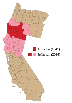 En 1859, aunque ya erigido Oregón como Estado de la Unión, la idea de erigir un Estado de Jefferson en la zona, cuando los condados californianos de Condado del Norte, Trinity, Shasta, Humboldt, Klamath, Siskiyou Tehama y Plumas, descontentos con los impuestos estatales que pagaban por los servicios (Correos, protección militar,...), clamaron por constituirse en Estado, secesionándose de California.