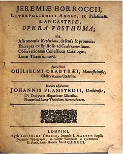 - ↑ a b Plummer, H.C. (April 1940 – September 1941). «Horrocks and his Opera Posthuma». Notes and Records of the Royal Society of London, 3. The Royal Society. pp. 39-52.