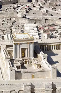 Según los evangelios sinópticos, a continuación fue al Templo de Jerusalén, y expulsó de allí a los cambistas y a los vendedores de animales para los sacrificios rituales[51] (el Evangelio de Juan, en cambio, sitúa este episodio al comienzo de la vida pública de Jesús, y lo relaciona con una profecía sobre la destrucción del Templo).[52] Vaticinó la destrucción del Templo[53] y otros acontecimientos futuros.