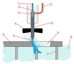 Uno de los elementos más importantes es la boquilla por la que sale el chorro; de ella depende la cohesión del chorro que condiciona en gran medida la viabilidad técnica de la aplicación, pues si el chorro es cónico se pierde poder de corte, precisión, calidad y las características de corte en seco.