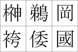 Abajo (de izquierda a derecha): 袴 - hakama (falda ceremonial); 倭 - Wa (Antiguo Japón); 國 - koku (país [forma tradicional]).