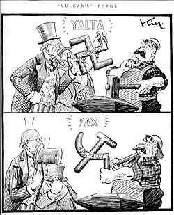 En Yalta, Stalin, a modo de dios Vulcano, recibe del tío Sam y de John Bull la Europa de la cruz gamada nazi y la transforma en la Europa de la hoz y el martillo comunista.