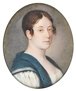 ![]() Retrato de la marquesa de Santa Cruz por Guillermo Ducker, 1813. Aguada, 7,8 x 6,5 cm. Museo del Prado, Madrid. | ||