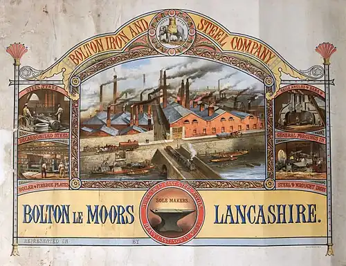 En 1860, los socios de B. Hick and Son, John Hick y William Hargreaves, se unieron al cuñado de Thomas Lever Rushton, Henry Sharp, como socios de Sharp and Eckersley, anteriormente Rushton y Eckersley, antes de que Rushton se jubilara de la empresa en 1859. Los tres socios Sharp, Hick y Hargreaves, formaron la Bolton Iron & Steel Company,[42][43] situada junto a la Union Foundry de Rothwell (en el emplazamiento de la antigua estación de autobuses de Bolton). La empresa suministraba los metales básicos requeridos por los principales fabricantes de la zona.[66] La producción de acero con el convertidor de Bessemer comenzó alrededor de 1860.[67] Se instalaron cuatro convertidores Bessemer de seis toneladas cada uno durante la década de 1860,[68] y las pruebas con los hornos de solera de Siemens comenzaron en 1867.