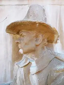 ![]() Busto escultórico en relieve del Capitán John Underhill del Underhill Burying Ground. | ||