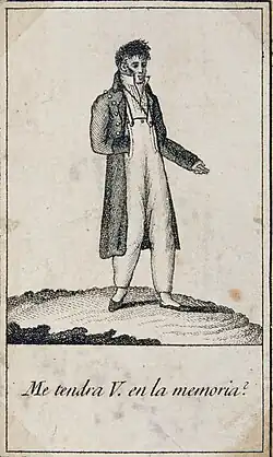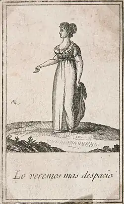 El juego de naipes, formado por sesenta cartas, treinta de caballeros y treinta de damas, se desarrollaba formando dos grupos: en el de los caballeros figuraba una pregunta del tipo de «Me da V. motivo de celos?» o «Querrá V. que sepan nuestro amor?», y en el de las damas una respuesta, como «A la vista está» o «No todas veces», de modo que combinadas al azar preguntas y respuestas daban lugar a situaciones procaces o cómicas.[15] Retiradas por la Inquisición, restablecida tras la ocupación francesa y la anulación de la obra legislativa realizada por las Cortes de Cádiz, fue llamado a declarar José Aparici, responsable de los dibujos, que se justificó diciendo que las había hecho con el único propósito «de mantener a su familia y de vivir, y que nunca creyó tuviesen malicia, ni oposición a las buenas costumbres pues obras por el mismo estilo se vendían antes de la invasión de los enemigos».[16] Como otra manifestación de la regresión que había traído la restauración del absolutismo, en 1819 hubo incluso quien denunció las estampas con desnudos del tratado de Varia conmensuración, aunque en este caso los calificadores del tribunal consideraron razonablemente que las imágenes no merecían censura pues eran «meramente facultativas y de estudio».[17]