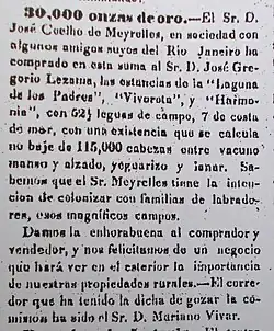 Coelho de Meyrelles, como parte y apoderado de esta "Sociedad Rural" de "amigos" de Río de Janeyro había adquirido a José Gregorio Lezama 3 estancias, "laguna de los Padres", "Armonía" y "San Julián de Vivoratá".