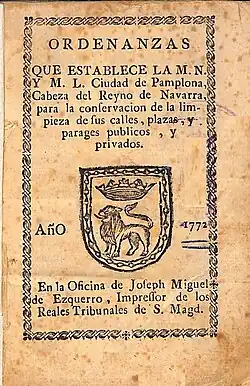 Por lo que respecta a trabajos para el Regimiento de Pamplona (Ayuntamiento), en 1758 factura 204 reales y 28 maravedís por la impresión y encuadernación del sermón de las exequias de la Reina María Bárbara de Braganza, pronunciado por el dominico José Martínez de Sicilia.[15]