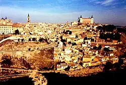 Ciudad de Toledo: en la parte superior derecha, dominando la ciudad, el Alcázar, fortaleza donde las fuerzas mandadas por Moscardó resistieron un asedio de 70 días.