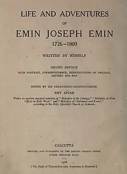 - Emin, Emin Joseph (1918). Apcar, Amy, ed. Life and Adventures of Emin Joseph Emin, 1726–1809 (Second edición). Calcutta: Baptist Mission Press.