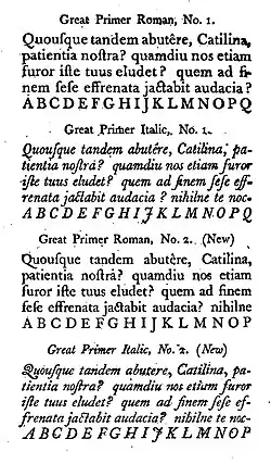 Sus nuevos tipos de imprenta se utilizaron en varios trabajos editados entre 1764 y 1770. El director de la empresa tipográfica Joseph Fry & Wm Pine era Isaac Moore, anteriormente un herrero de Birmingham, después de cuya rápida admisión en la sociedad se organizaron unos talleres en Londres.[2][3]
