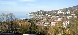 Está situado sobre la vertiente sureste del monte Mali Ajún, en la desembocadura del río Josta en el mar Negro y ocupa la orilla de la bahía Tijaya y del cabo Vidni.