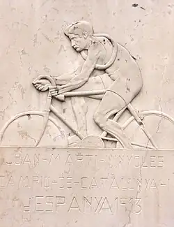 Juan Martí reposa en el cementerio de la Doma bajo un relieve escultórico que representa el campeón carrasqueño en 1913 cuando ganó la Vuelta Ciclista a Cataluña, imagen que fue extraída de una fotografía publicada en la revista Stadium .